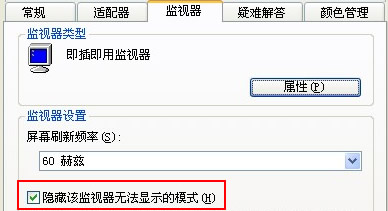 | 2、点击“高级”按钮,并切换到“监视器”选项卡,取消“隐藏该监视器无法显示的模式”的小钩(如下图) |